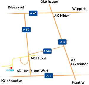 Unser Unternehmen liegt verkehrsgünstig gelegen zwischen Köln und Düsseldorf, nur drei Minuten entfernt vom Autobahnkreuz A 59/ A 542,